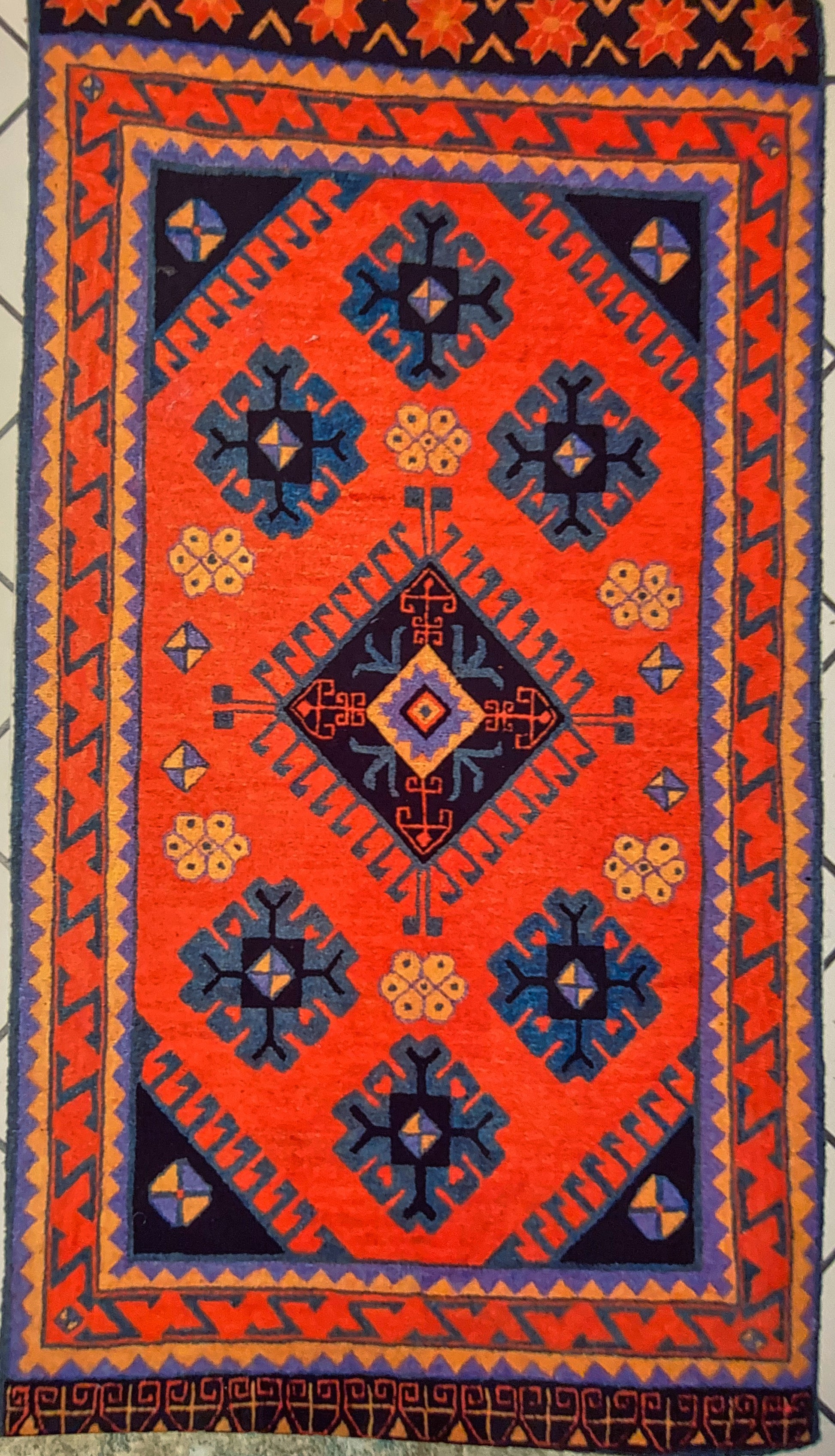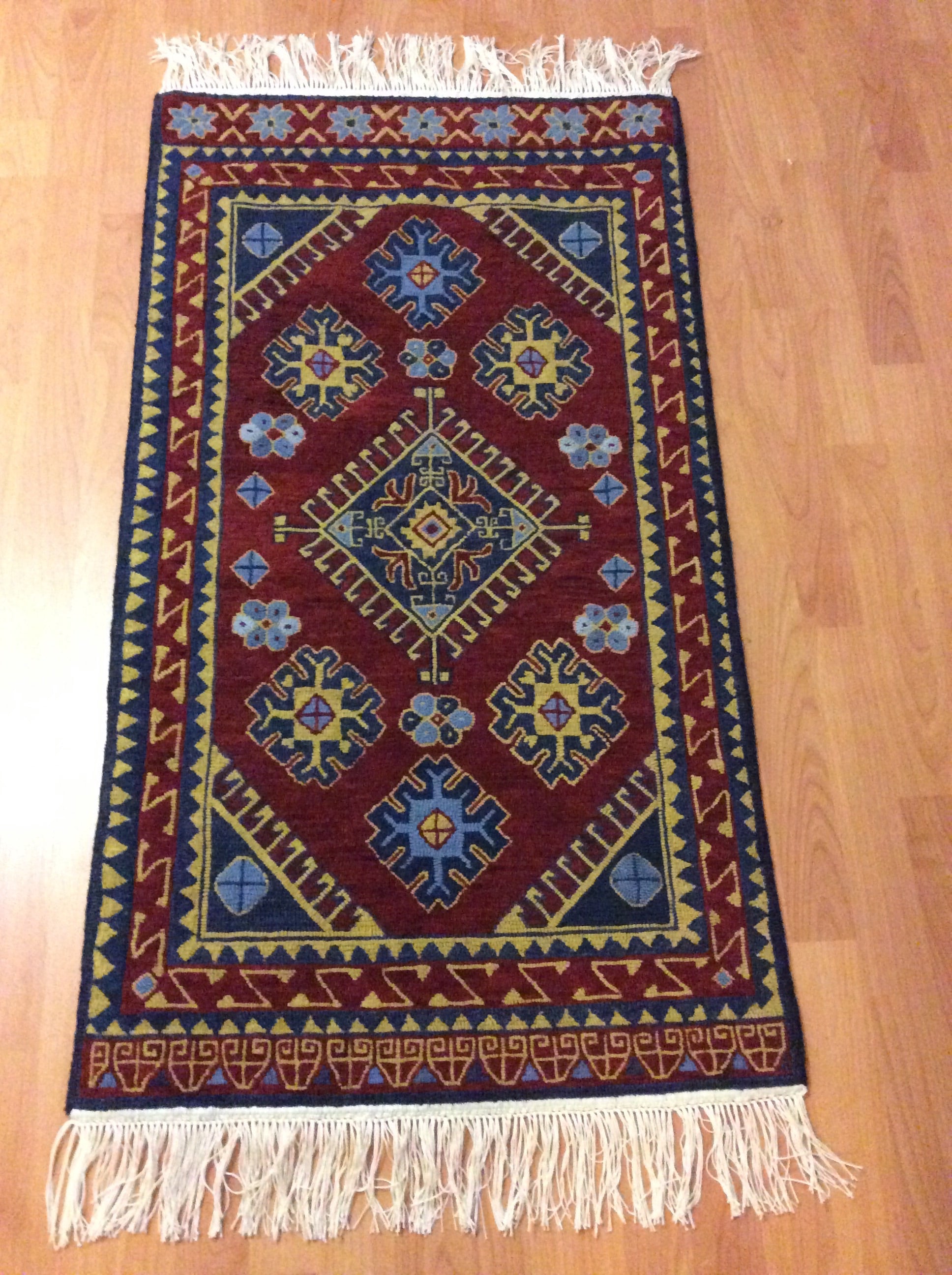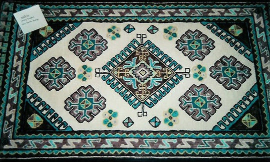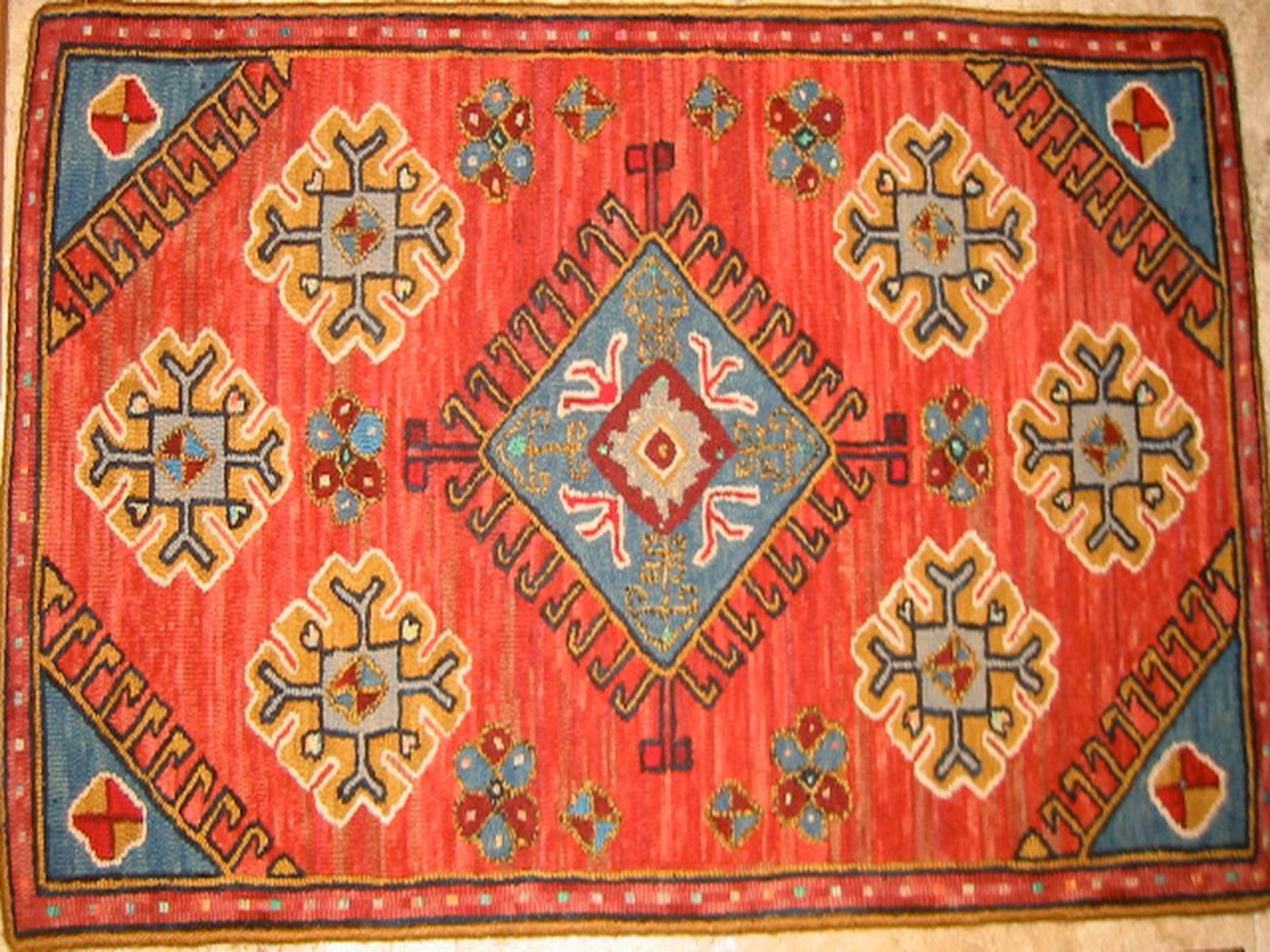 27"x48". A beautiful Oriental piece with a relatively "easy" pattern to follow. This design was taken from the Lewis book of Orientals, a rare rug design from Asia Minor.