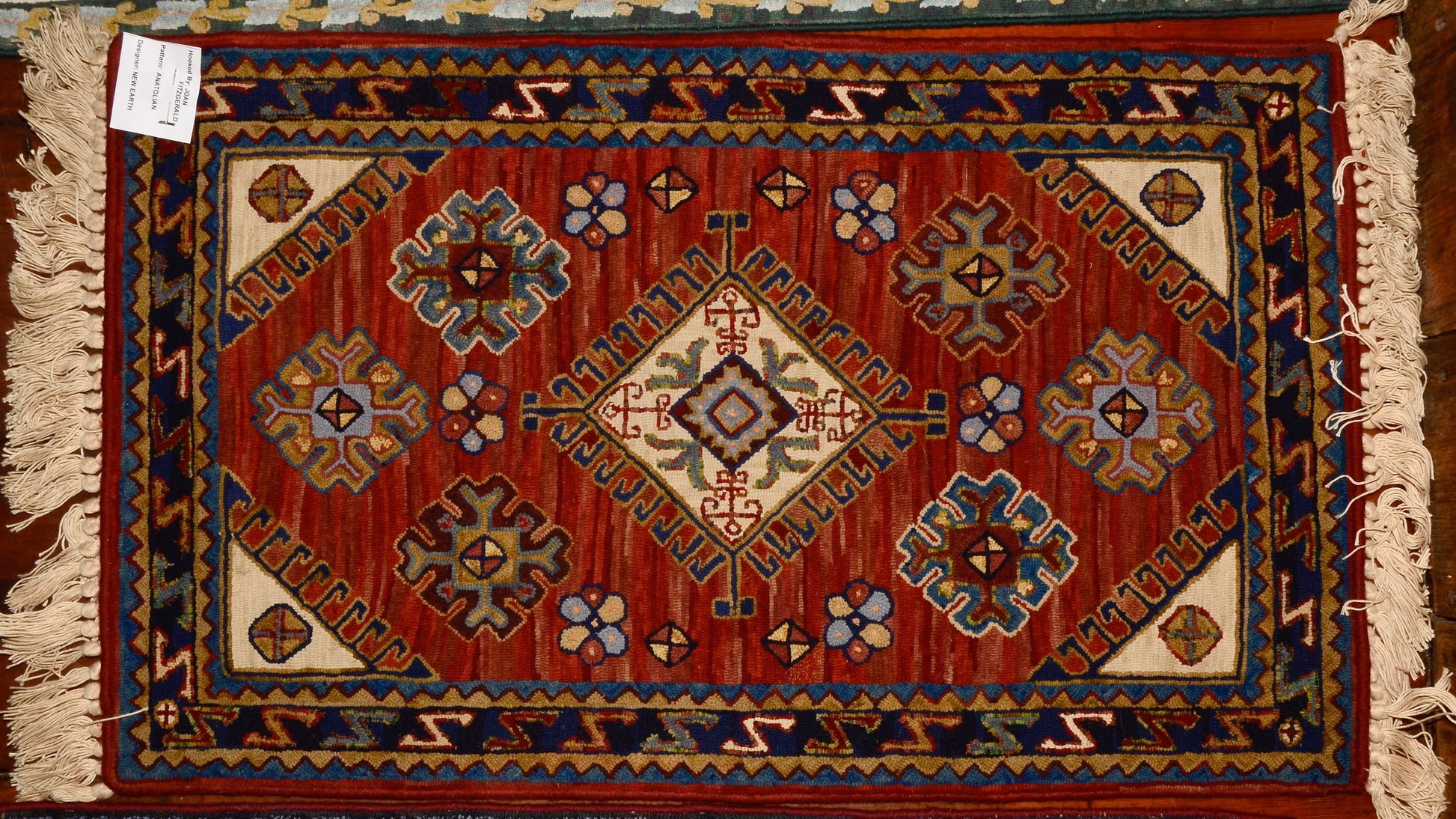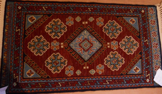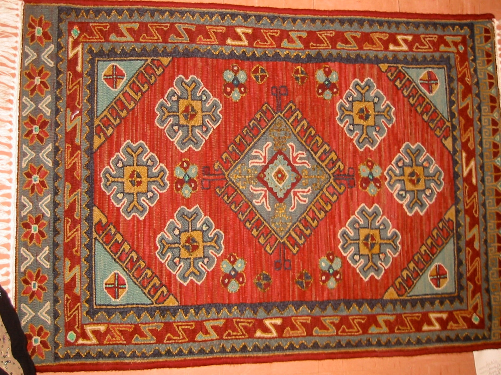 27"x48". A beautiful Oriental piece with a relatively "easy" pattern to follow. This design was taken from the Lewis book of Orientals, a rare rug design from Asia Minor.