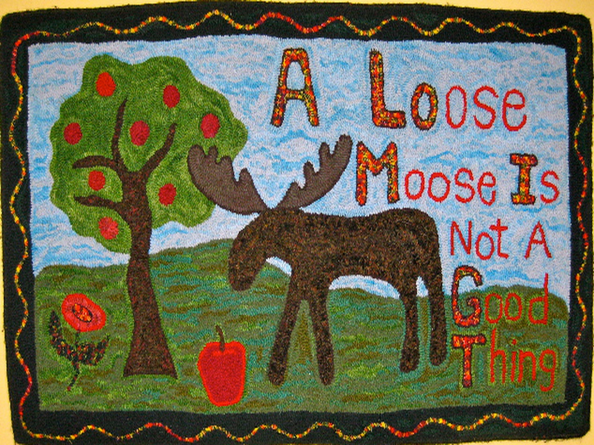 24.5"x42". Jeanne Benjamin designed this piece for Ann Tuttle as a reminder of the time she had a moose family destructively living in their orchard! Might now be a great memory, but it certainly is a great rug...especially if you also live in moose country!