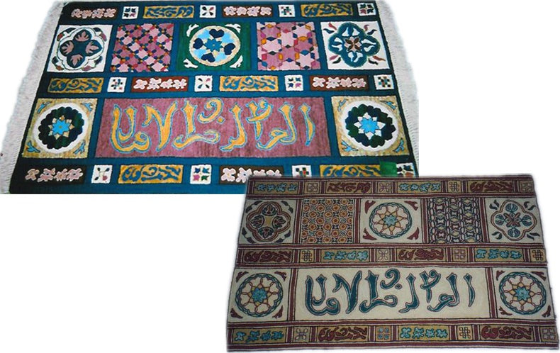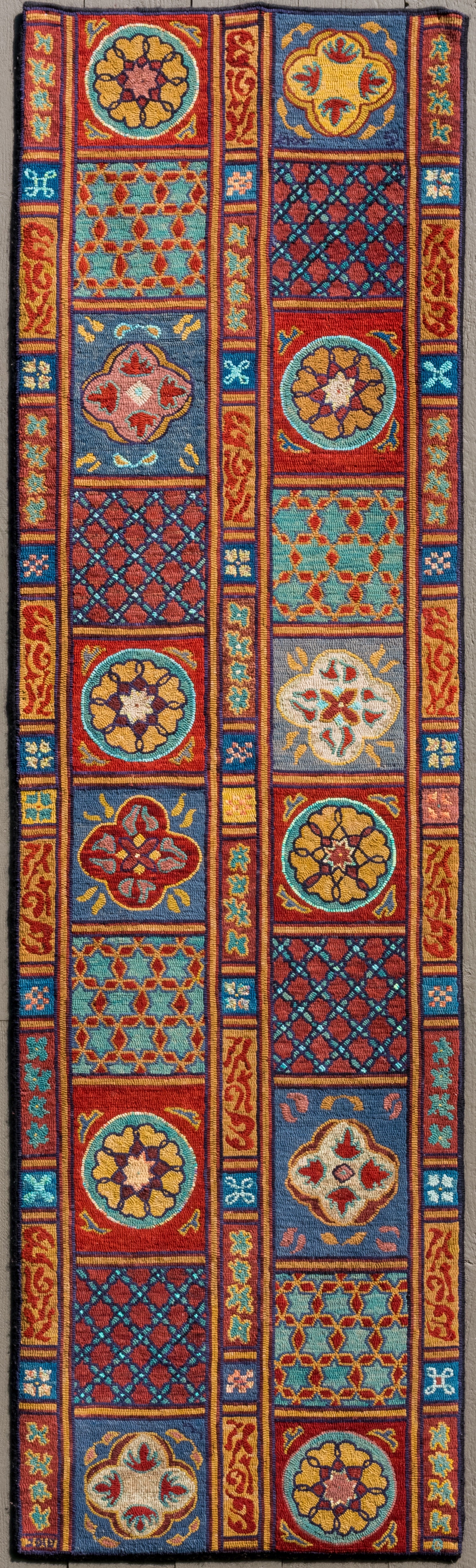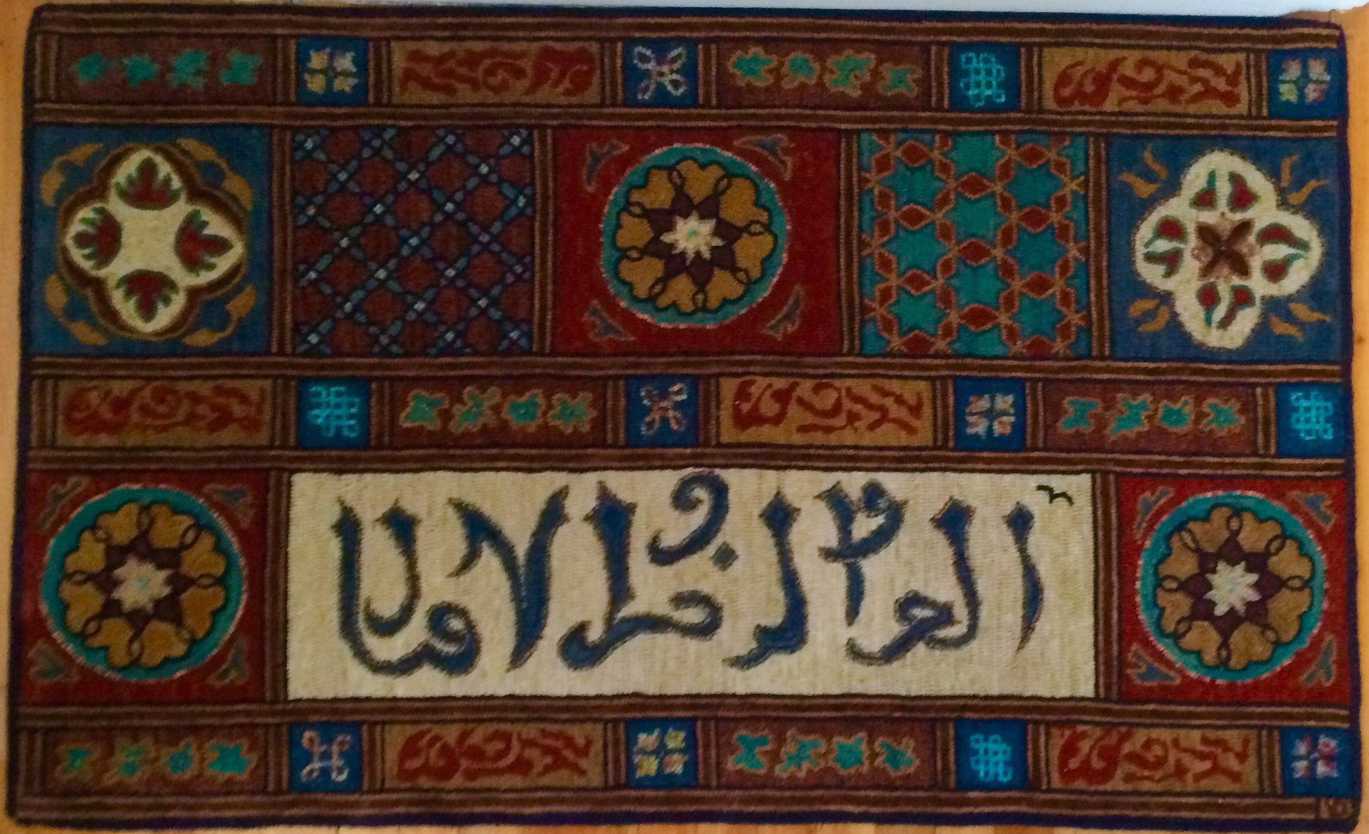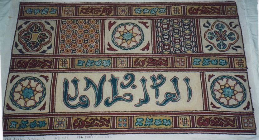 31"x51". This design was from a piece of 13th century silk. The Arabic inscription reads, "Glory, Victory, and Prosperity". One of these piece were done by Laura Salvati who wanted to capture an Italian marble feel; the other was made into a runner and hooked by Louise Gleason.