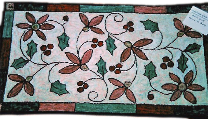 18"x34". This piece can stay out weeks before and after Christmas! The stained glass edge is great for spot dyes. You could even have it framed with stained glass for a complete look!