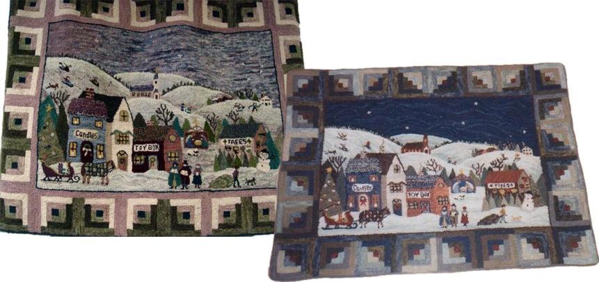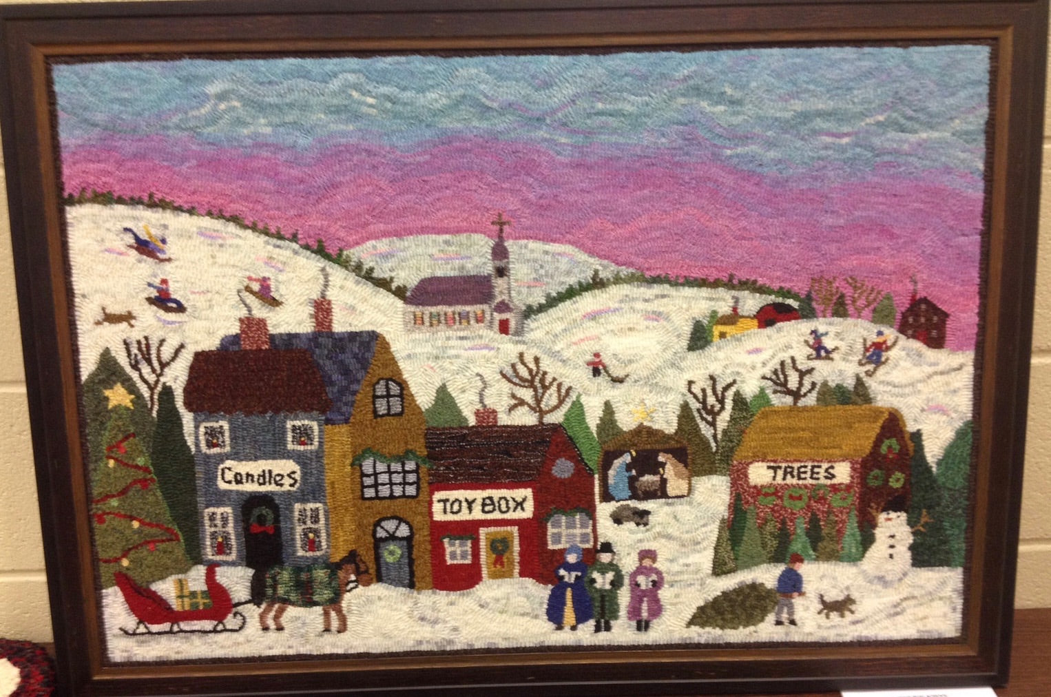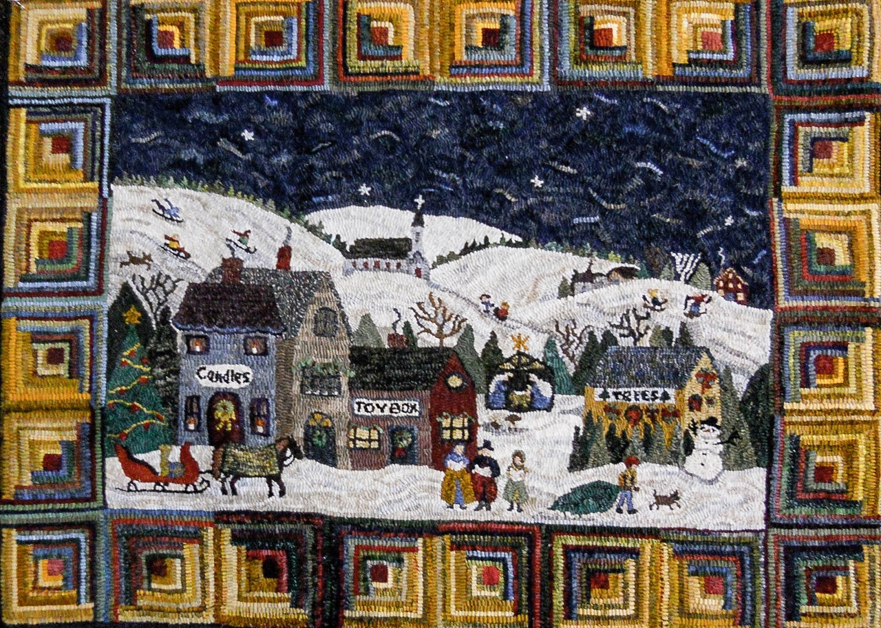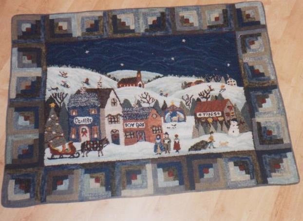 31.5"x42. This design by Jeanne Benjamin depicts a wintery scene in a small New England town with the quilting border. She challenged herself to hook without red and green!
