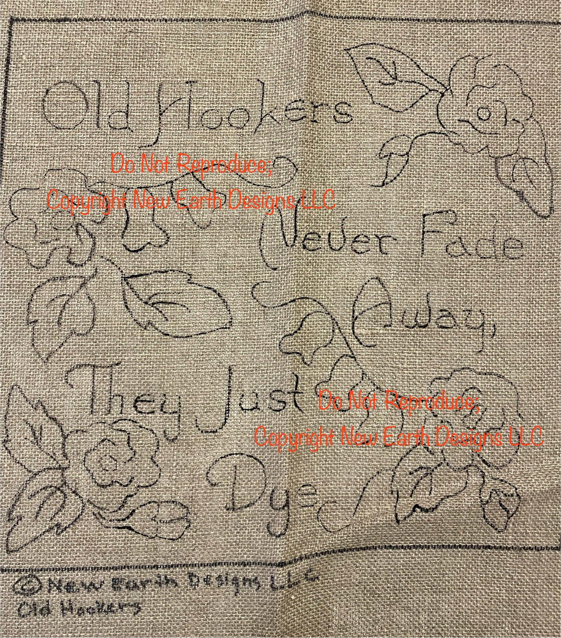 14"x16". "Old Hookers Never Fade Away, They Just Dye". Very true words, don't you think? What fun this piece could be with leftovers and wide cuts! You could frame it for a friend (or yourself) or make a cute pillow out of it!