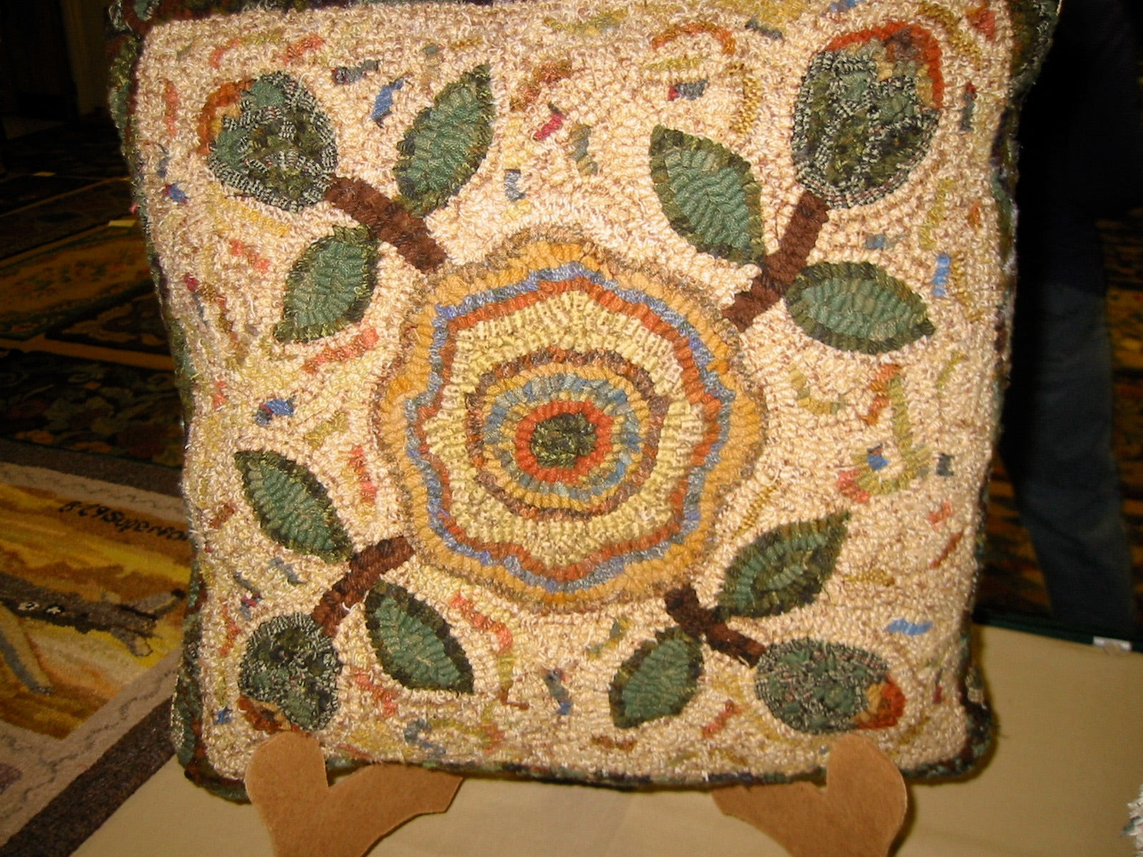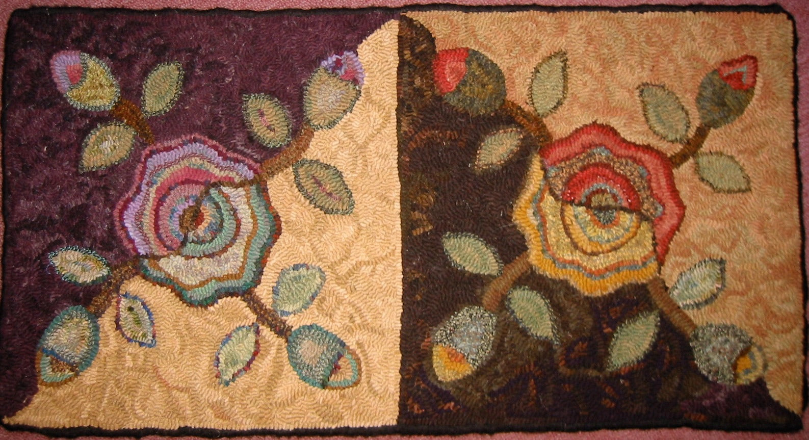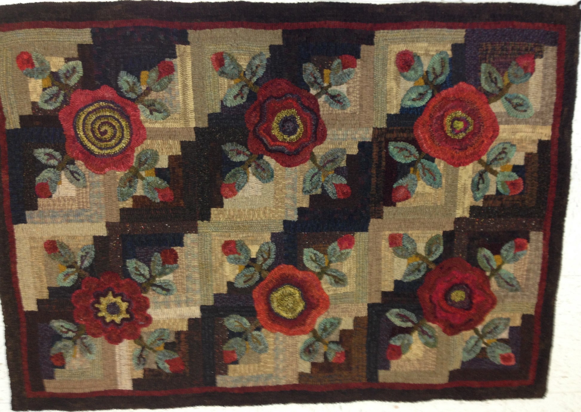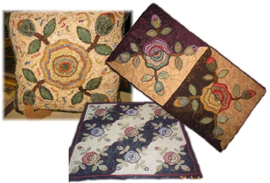 Jeanne (Benjamin) taught this at a workshop and did the rose in four color schemes! Nancy Thompson completed this as a 9 block rug!