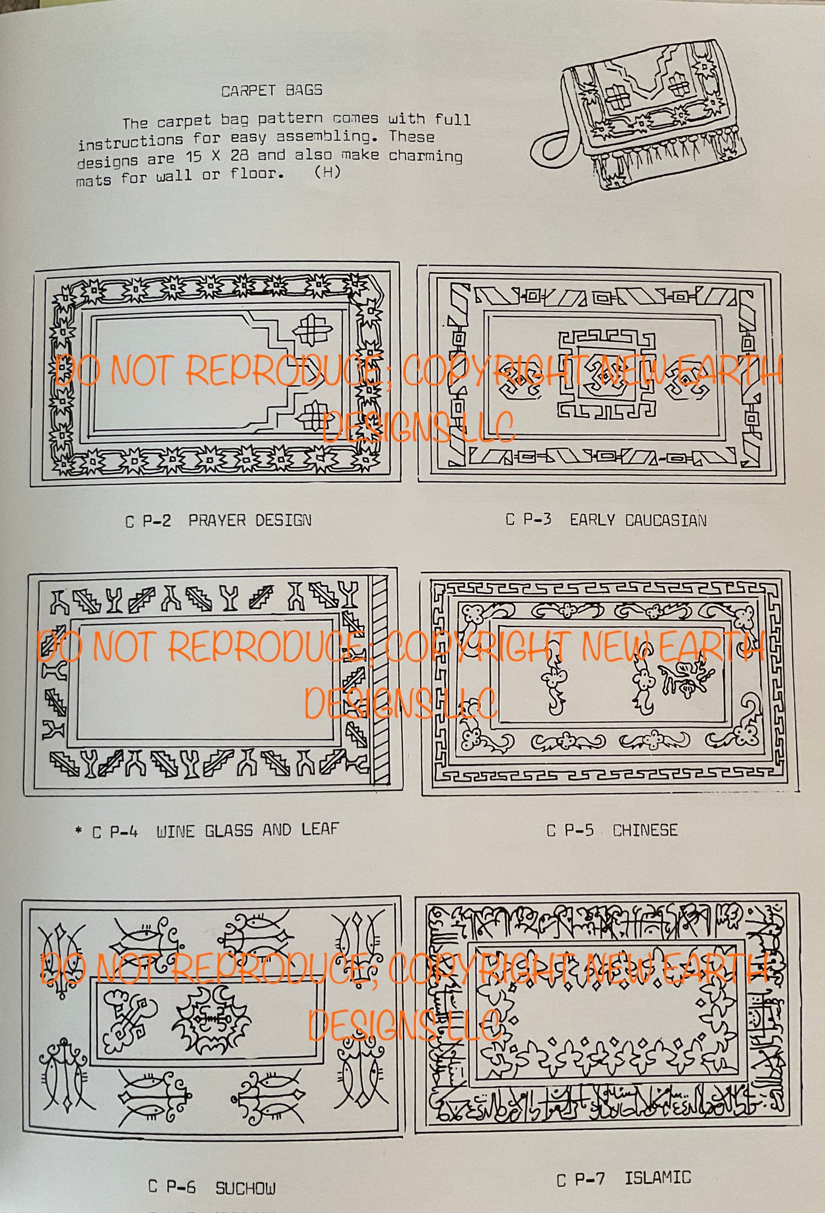 15"x28". The carpet bag patterns come with full instructions for easy assembly. These designs also make charming mats for wall or floor.